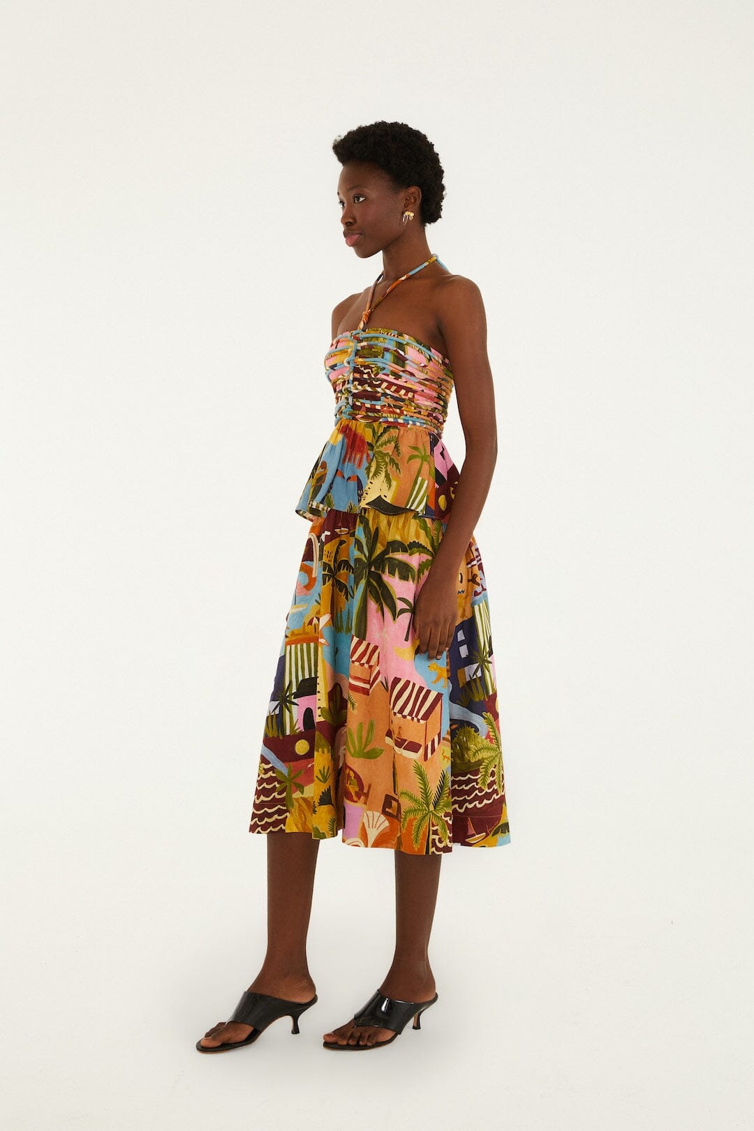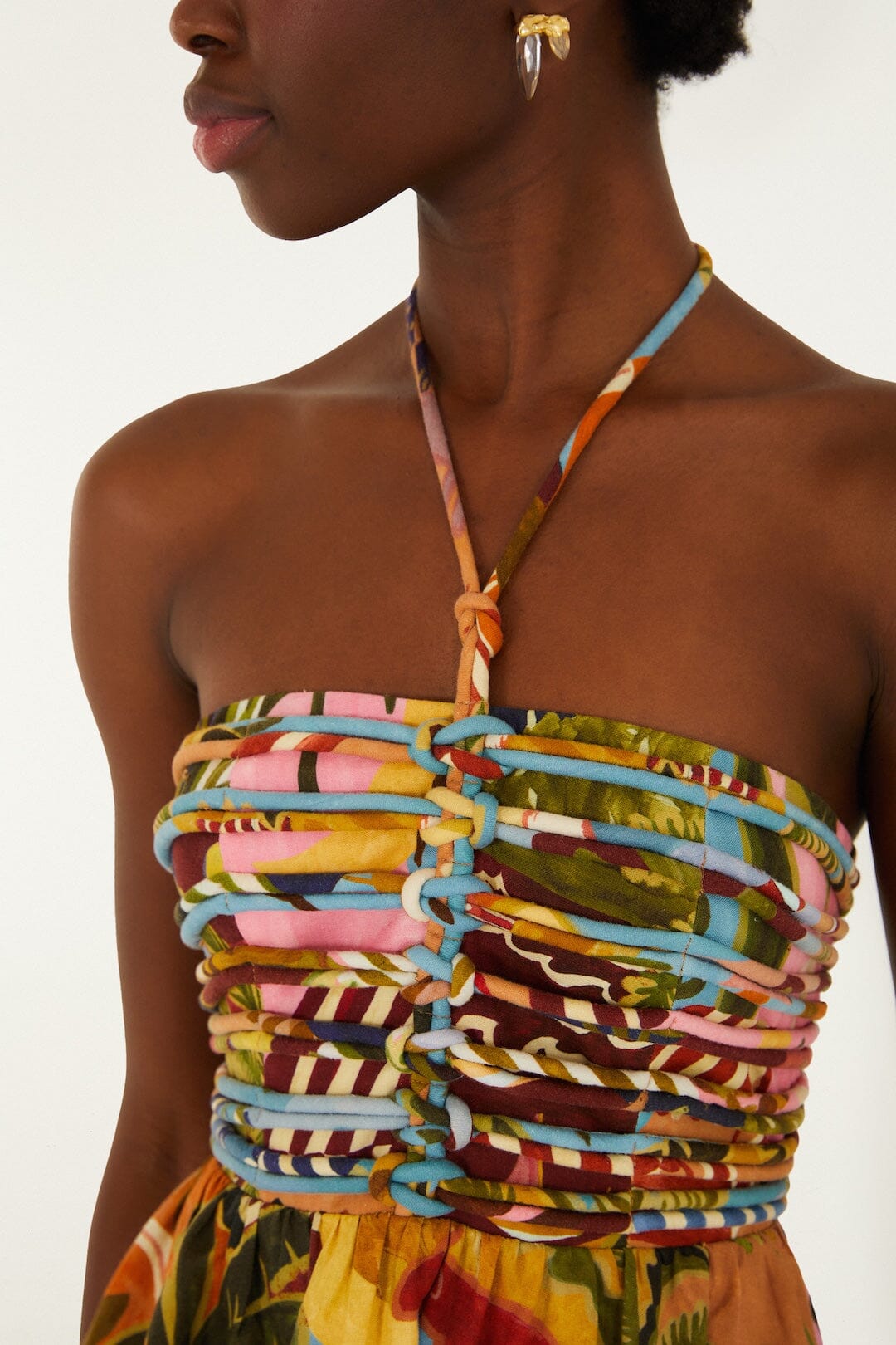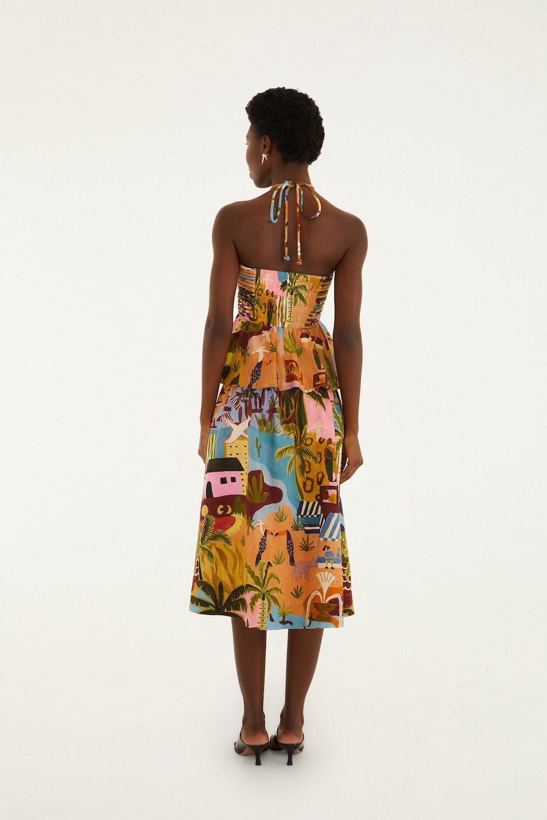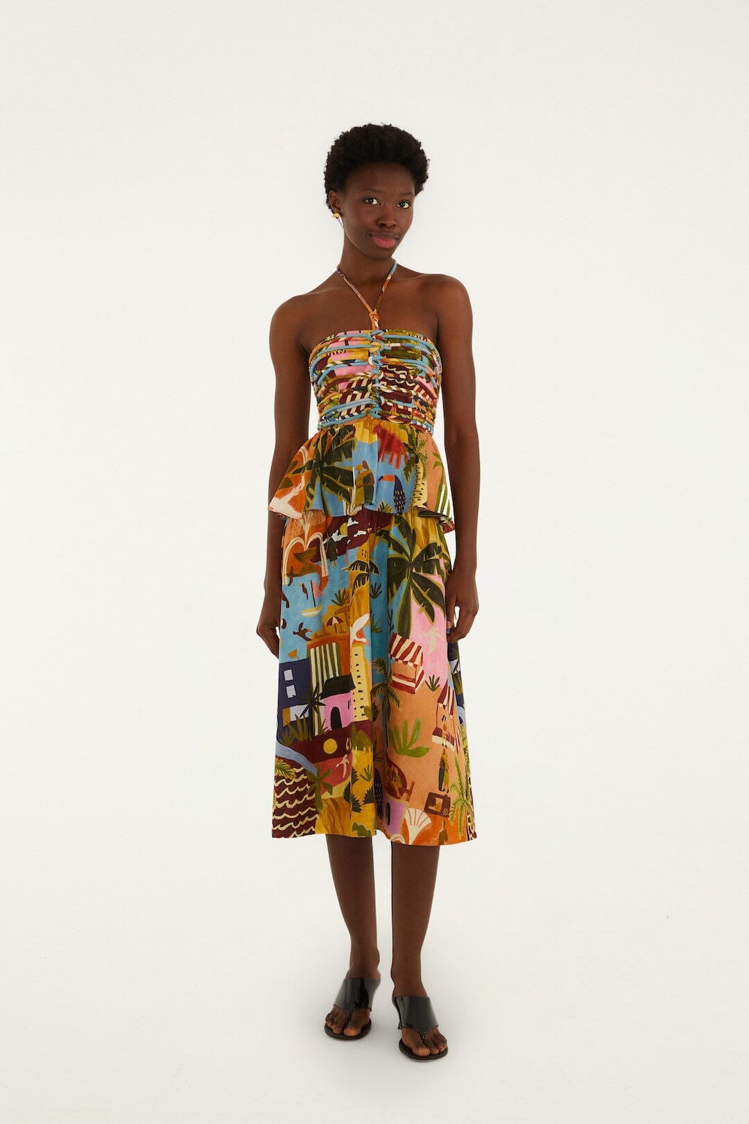 Wrap yourself in the vibrant spirit of FARM Rio with the Multicolor Tropical Painting Midi Dress. Crafted from eco-friendly Euroflax and Lenzing fabrics, this dress dances with bold tropical patterns in a burst of lively hues. The halter neckline elegantly frames the shoulders, while the flowing midi silhouette moves effortlessly with every step, embodying warmth and playful sophistication perfect for sunny adventures and carefree moments.
