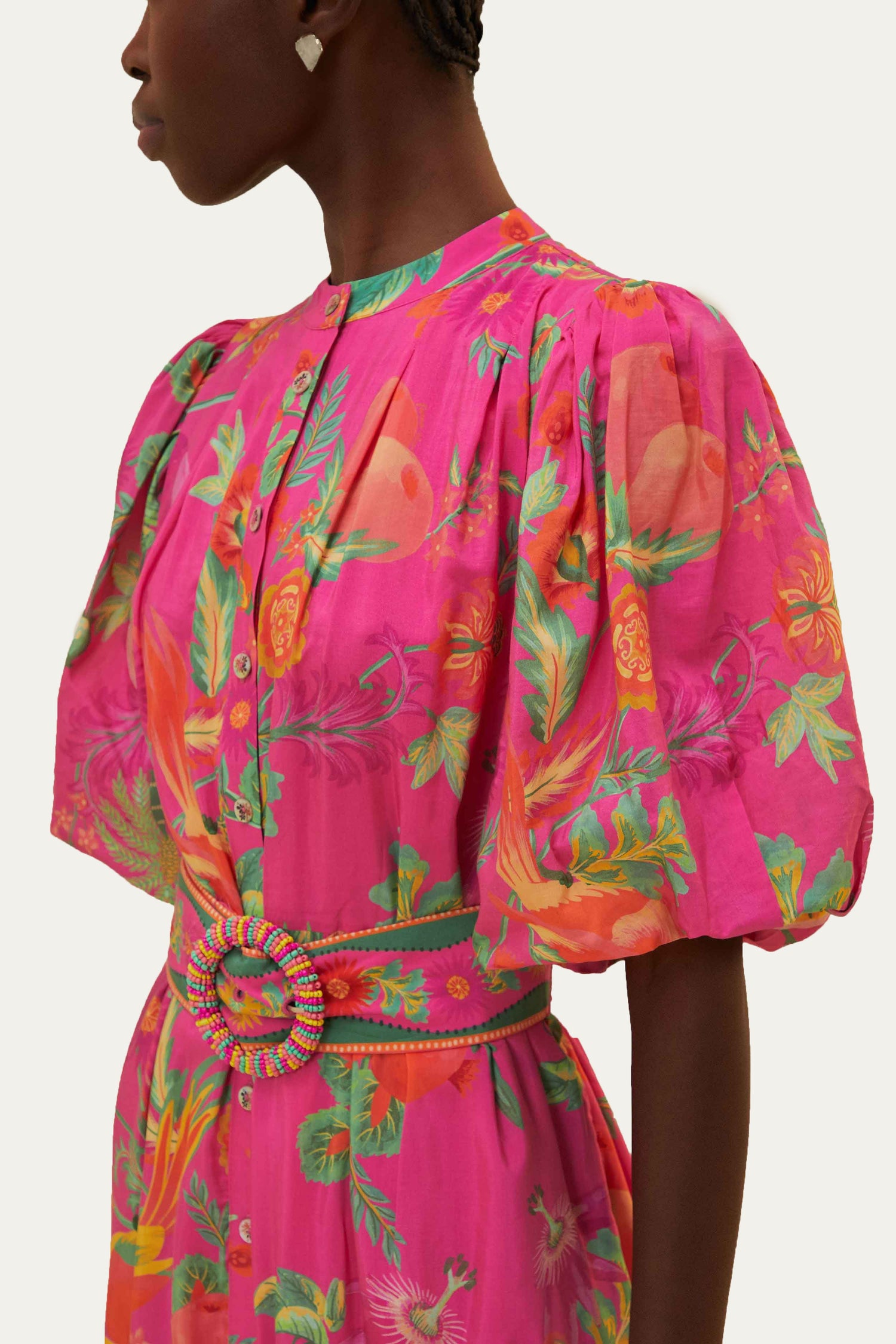 Embrace the vibrant essence of summer with the Pink Delicate Fruit Garden Mini Dress by FARM Rio. This enchanting piece features a round neckline and is adorned with an exuberant fruit and floral pattern set against a vivid pink backdrop. The playful puff sleeves and flirty ruffled hem lend a dash of whimsy, while the cinched waist, accented with a unique, colorful beaded belt, creates a flattering silhouette. Its joyful design ensures you'll stand out in any sun-kissed setting.