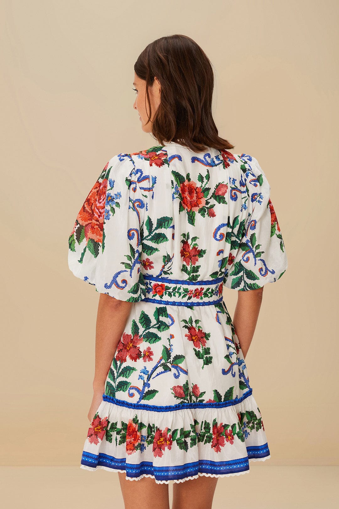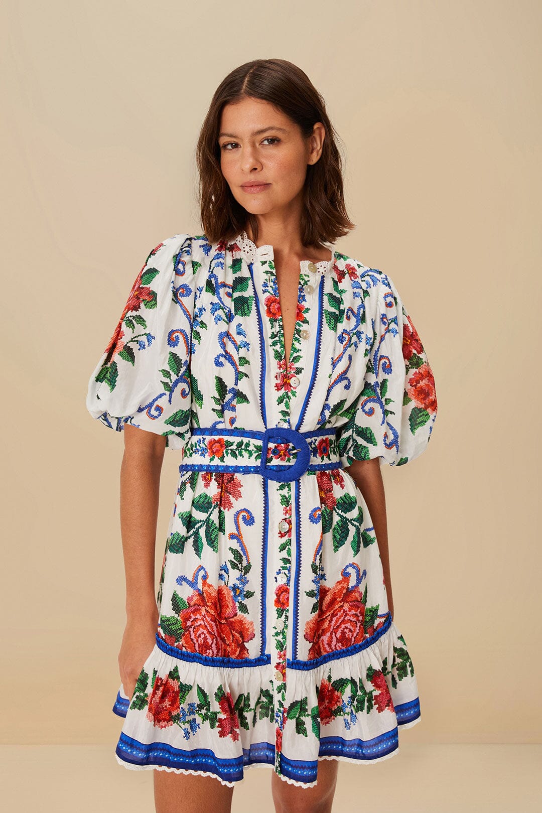 Embrace playful elegance with the Off-White Flower Tapestry Mini Dress by FARM Rio. This enchanting piece showcases a vibrant floral tapestry against a soft, off-white backdrop. Its high neckline and voluminous sleeves add a touch of sophistication, while the intricate belt cinches the waist beautifully. Delicate lace detailing at the neck enhances its charm, making it a delightful addition to your wardrobe.