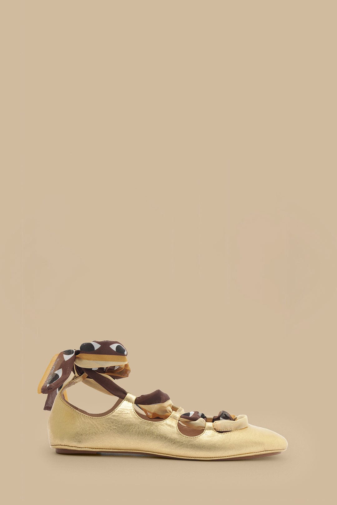 Step into a world of playful elegance with the Gold Lace Up Scarf Ballerina shoes from FARM Rio. Crafted with responsible materials, these golden beauties showcase charming scarf-style lace-ups adorned with intricate embroidery. The soft, shimmering gold hue adds a touch of whimsy, while the artisanal details evoke a sense of vibrant joy. Perfect for adding a splash of warmth and enchantment to any ensemble.