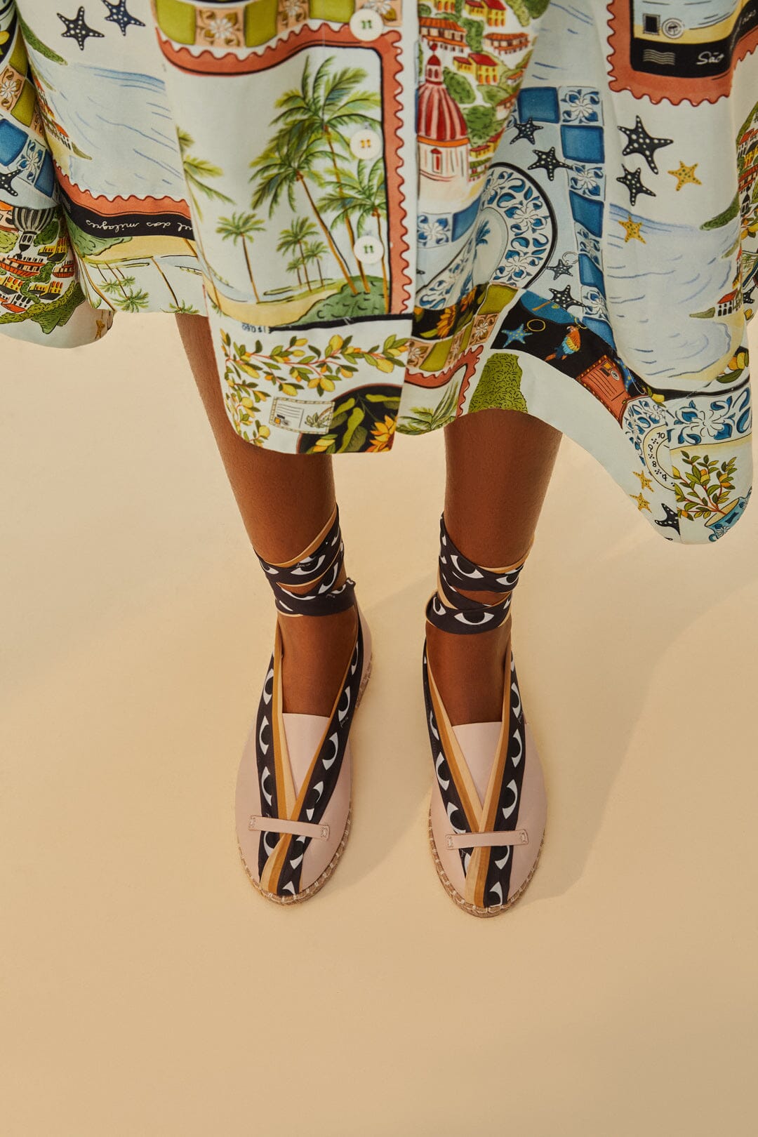 Step into playful elegance with the Blush Lace Up Espadrille Sandal by FARM Rio. Crafted from responsible materials, these sandals feature delicate blush tones paired with striking embroidery, making each step feel like a work of art. The enchanting lace-up design wraps around the ankle, adding a touch of whimsy and charm. Perfect for those sunny days, this sandal transforms any outfit into a joyful celebration.