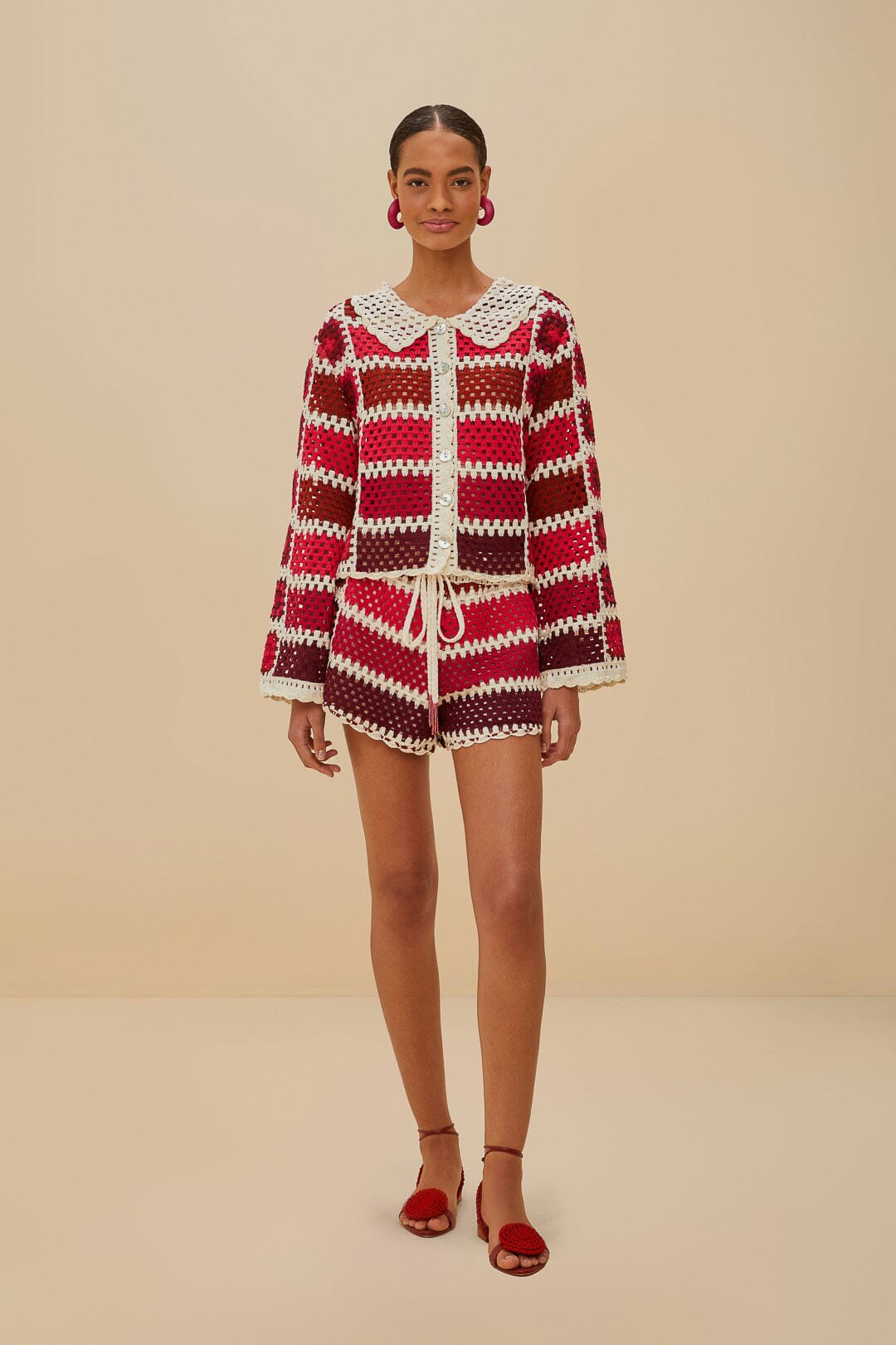 Embrace vibrant elegance with the Red Colorful Crochet Tiles Shirt by FARM Rio. This piece showcases a playful mosaic of red, pink, and plum hues, intricately arranged in bold checked patterns. The collar neckline adds a touch of sophistication, while delicate scalloped edges offer whimsical charm. Crafted with crochet tiles, this shirt is a captivating blend of artistic flair and cozy warmth, perfect for adding a splash of color to your wardrobe.