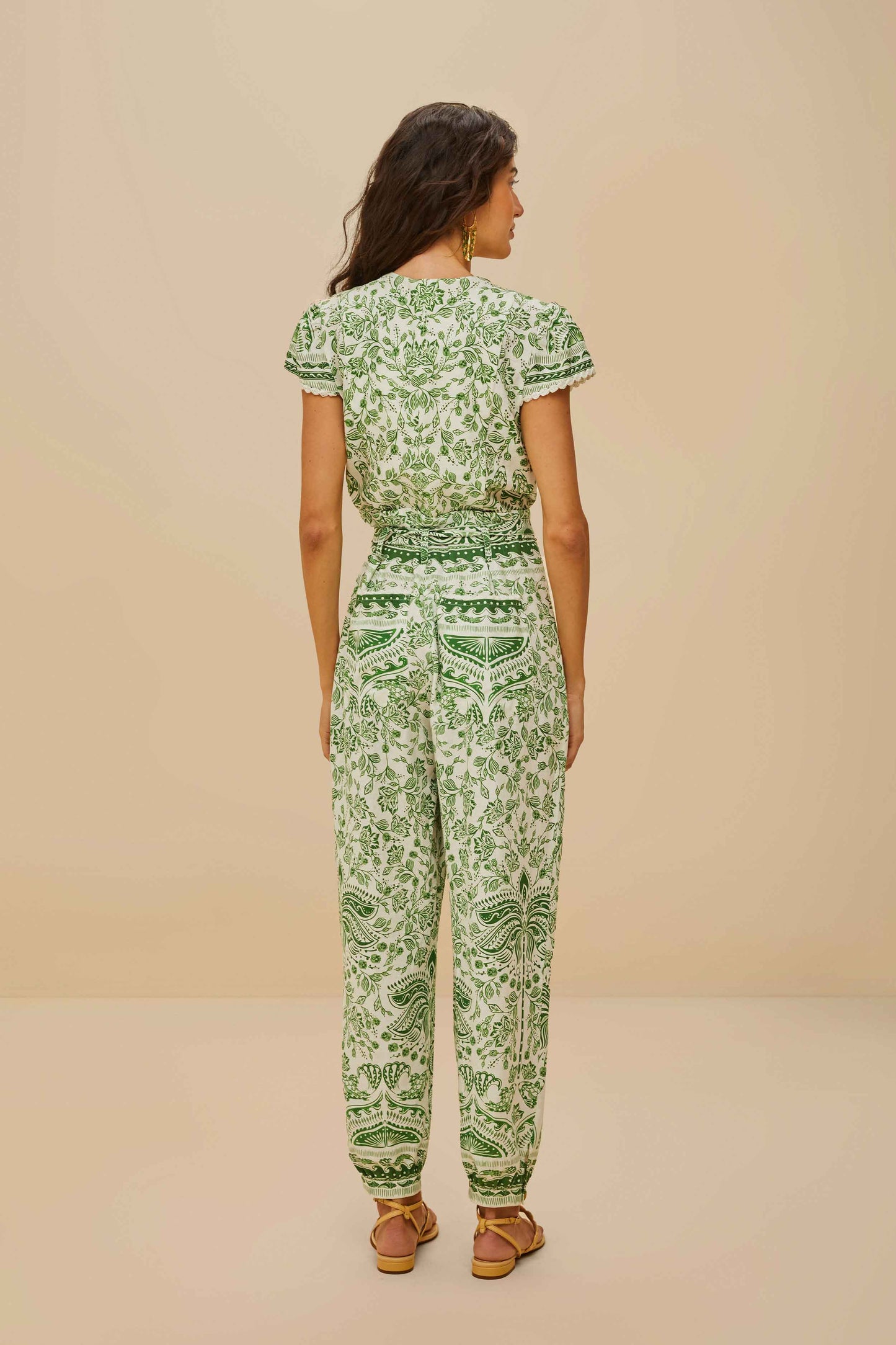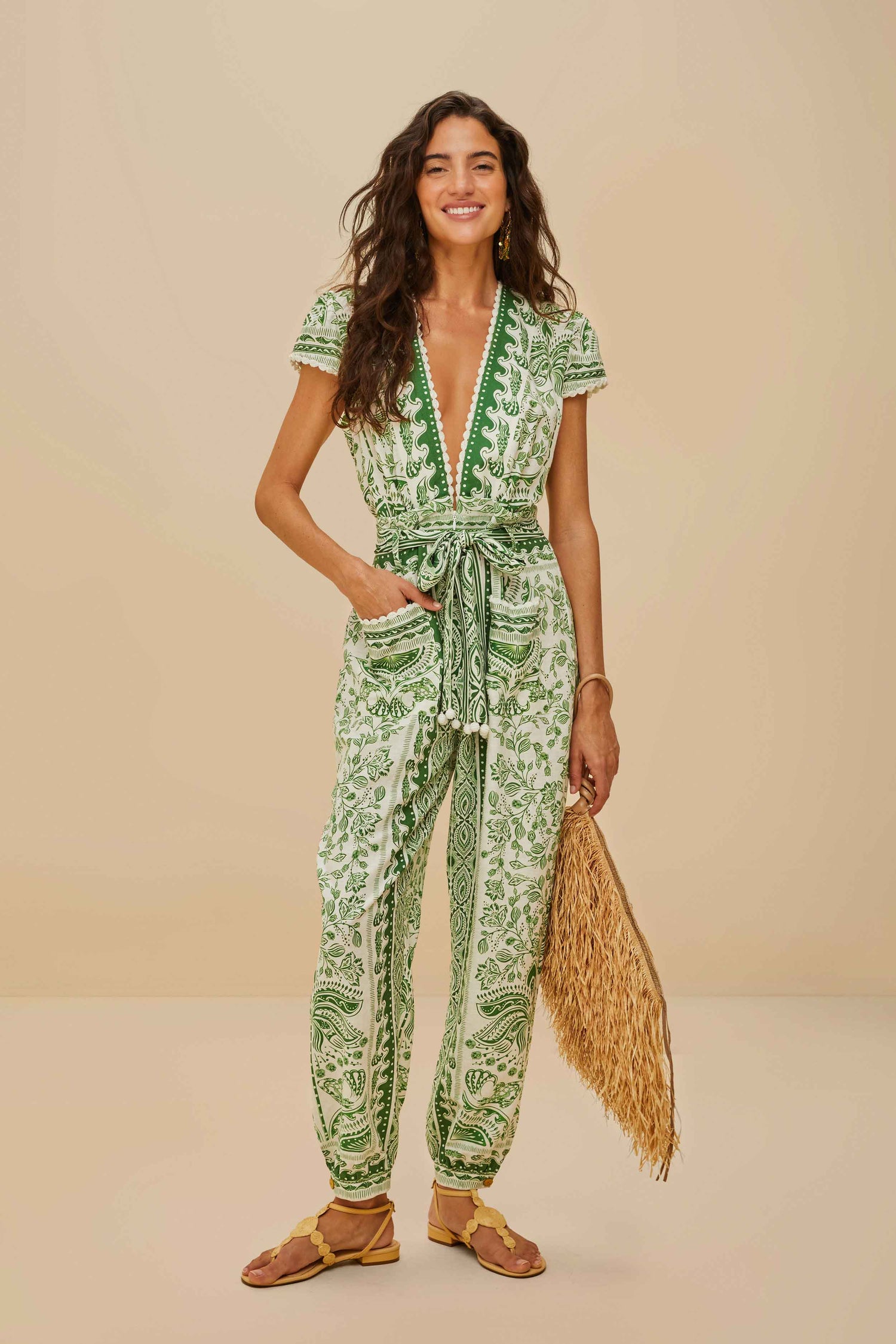 Discover the allure of the Green River Ride LENZING™ ECOVERO™ Euroflax™ Jumpsuit. Crafted from responsible materials, it features an enchanting V neckline and captivating paisley patterns in refreshing green hues. The playful tie waist adds charm, while the short sleeves are delicately trimmed. Immerse yourself in its effortless elegance and embrace a sunlit adventure with style, perfect for those who cherish vibrant, thoughtful fashion.