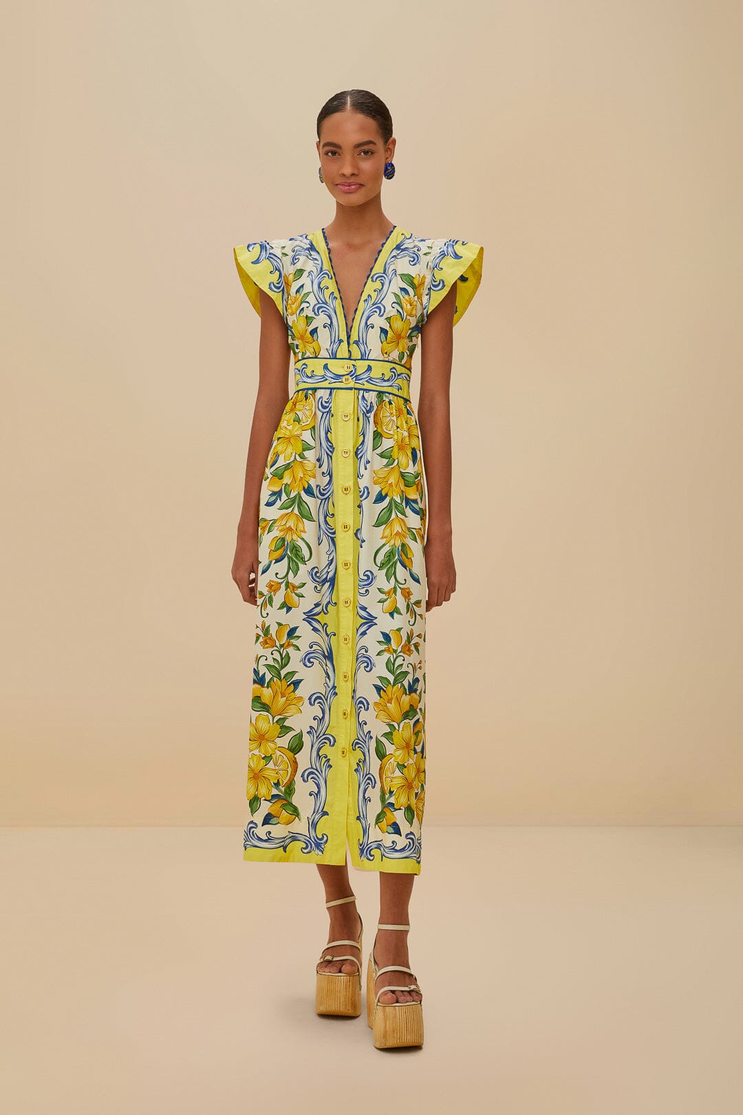 Embrace an enchanting blend of vivid charm and playful elegance with the Off-White Sicily Scarf Organic Cotton Maxi Dress by FARM Rio. Crafted with responsible materials, its lively floral pattern blooms against a backdrop of soft hues, highlighted by a flattering V neckline. The dress features butterfly sleeves and a cinched waist, creating a breezy, yet sophisticated silhouette that effortlessly captures the spirit of tropical artistry.