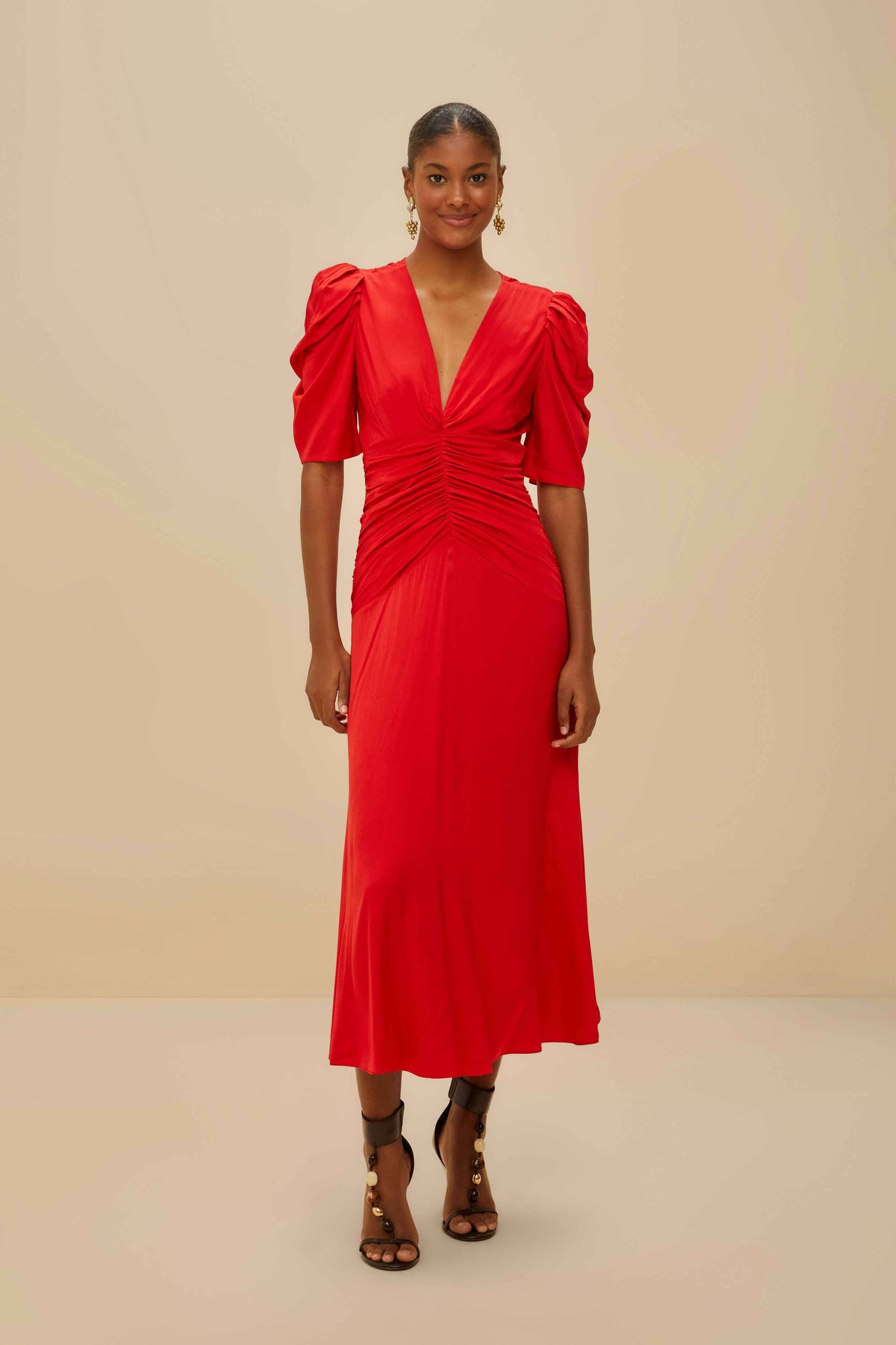 The Red Gathered Midi Dress from FARM Rio is a celebration of bold elegance and playful charm. Its vivid red hue captures attention, while the artful gathering along the bodice complements the graceful flow of the midi-length skirt. Delight in the puffed sleeves and a flattering V neckline that add a touch of romance, creating the perfect blend of comfort and sophistication for any occasion.