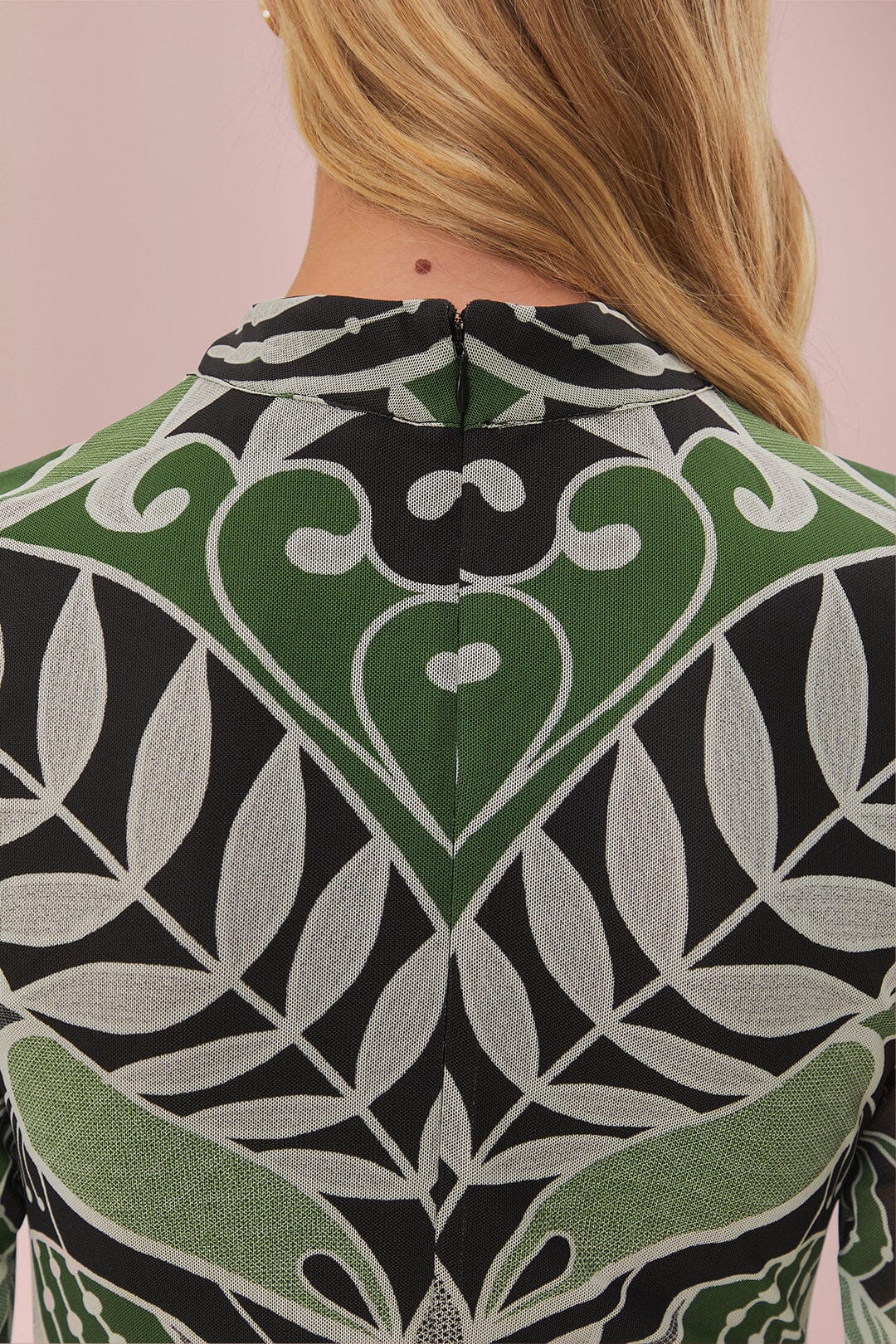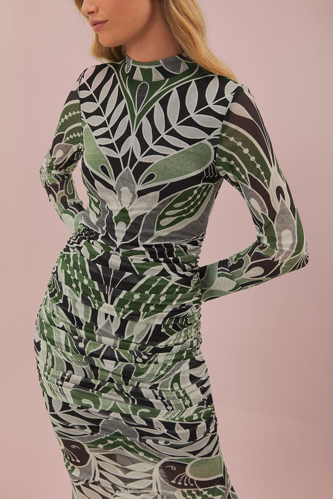 Immerse yourself in the enchanting world of FARM Rio with the Black Lace Nature Tulle Midi Dress. Elegantly crafted with a high neckline, this dress showcases a harmonious blend of intricate black lace patterns on sheer tulle, set against a lush backdrop of green botanical motifs. Its fitted silhouette gently skims the body, while the midi length adds a touch of timeless grace. The unique pattern placement ensures every piece is a wearable work of art, perfect for moments when you want to turn heads and celebrate nature's beauty.