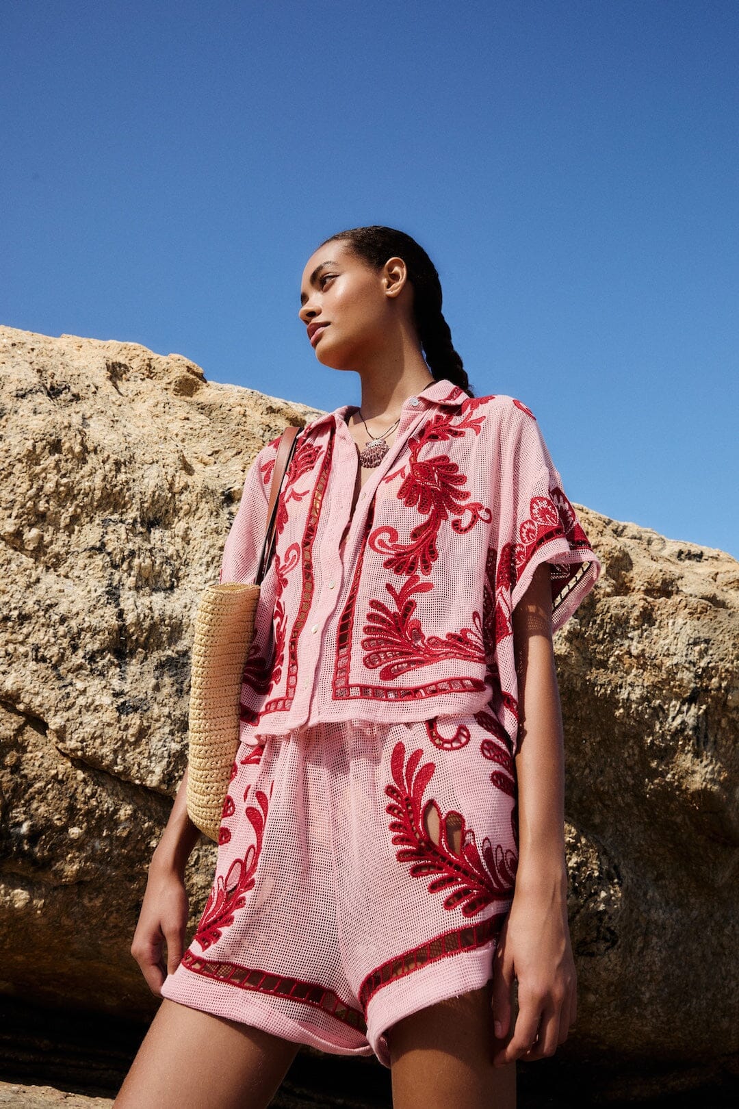 Dive into effortless charm with the Light Pink Arabesc Shorts by FARM Rio. Crafted in a soft pastel pink, these swim shorts feature delicate arabesque patterns that dance across the fabric, evoking a playful tropical spirit. The relaxed silhouette embraces comfort while the subtle flow adds a breezy, feminine touch. Perfect for sun-soaked days, they bring a radiant warmth and joyful energy to your beachside moments.