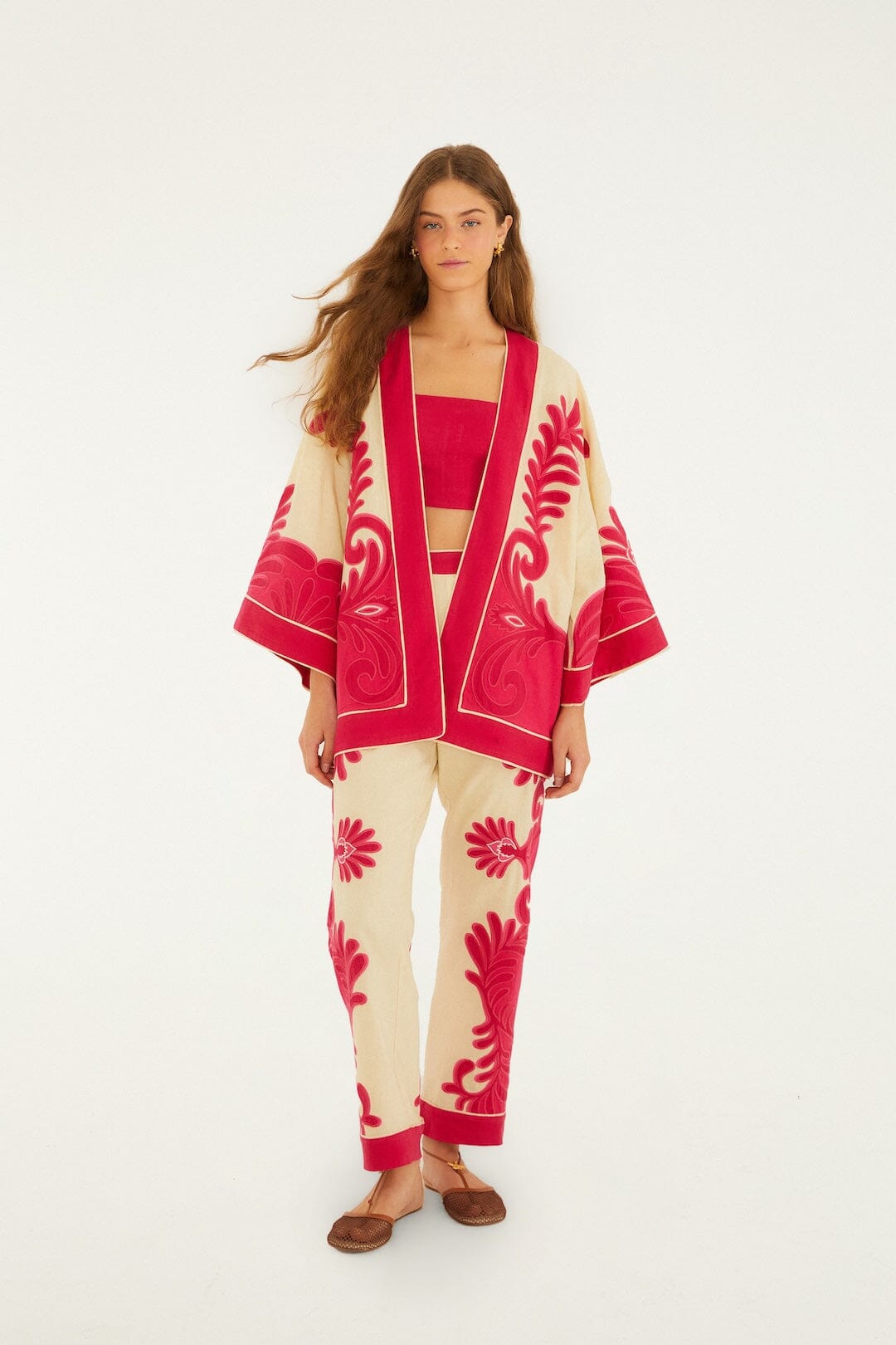 Embrace effortless charm with the Pink Spring Arabesc Cutwork Kimono by FARM Rio. Crafted from eco-friendly Euroflax and Lenzing fibers, its soft, breathable fabric is adorned with delicate arabesque cutwork that dances lightly across the silhouette. The flowing kimono shape, paired with a graceful V neckline, creates an airy, relaxed fit that moves with you—perfect for layering warmth with a playful, artistic touch.