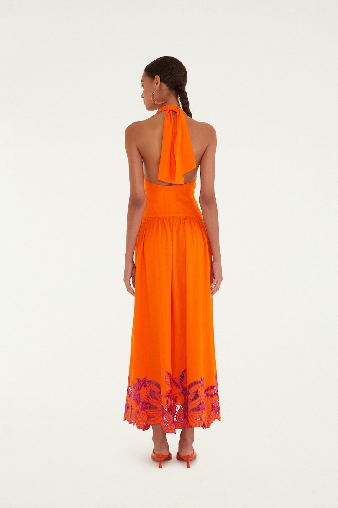 Embrace vibrant Brazilian spirit with the Orangee Fruit Richelieu Maxi Dress by FARM Rio. Crafted from sustainable Lenzing™ Ecovero™ and Euroflax™, this dress dances with bold orange hues and playful fruit-inspired patterns. Its halter neckline gracefully frames the shoulders, while delicate Richelieu embroidery adds artisanal charm. Flowing silhouettes and breezy fabric create an effortless, joyful movement—perfect for sunlit days and warm evening adventures.