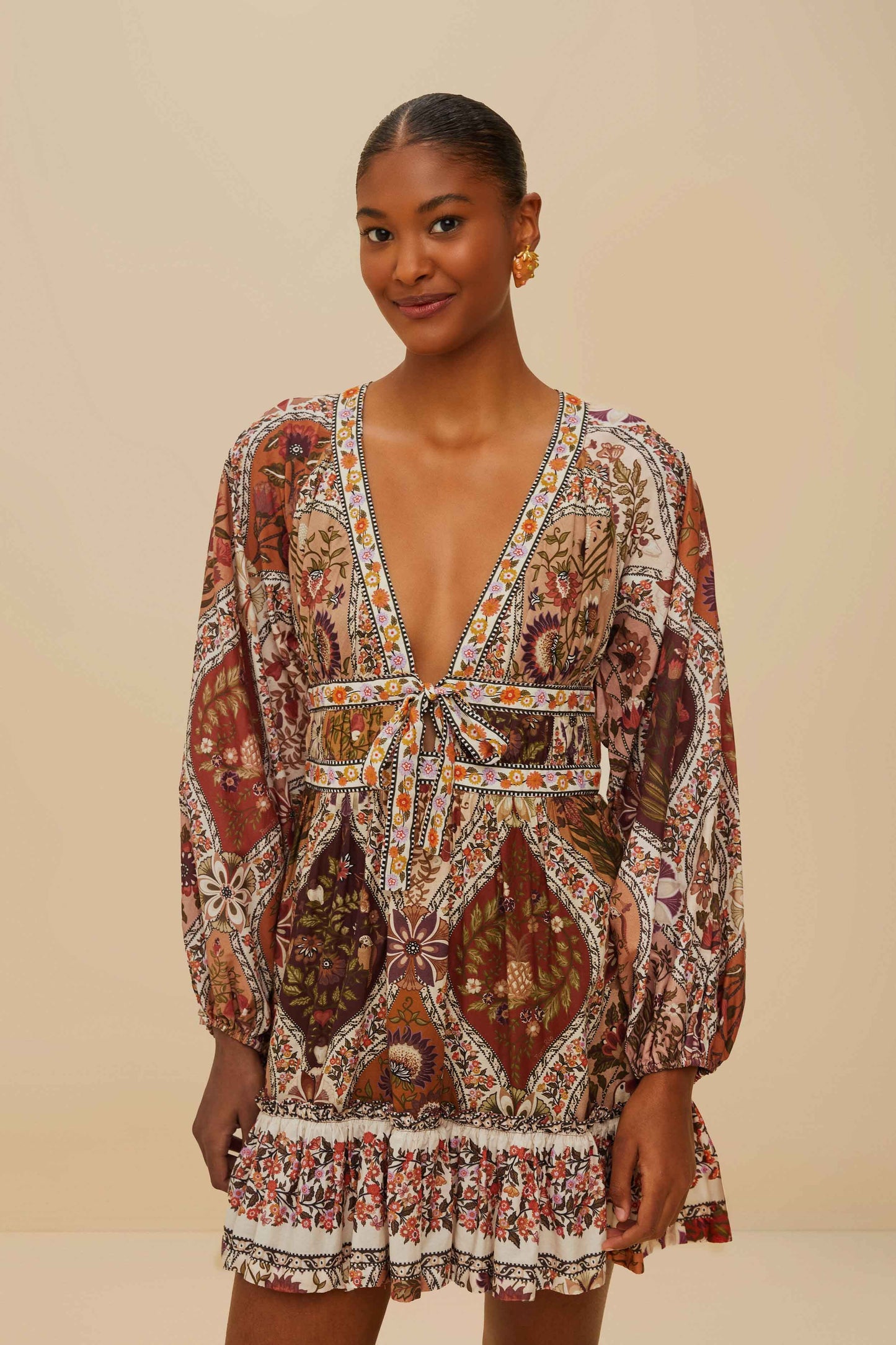 Step into a world of enchantment with the multicolor romantic nature mini dress from FARM Rio. This captivating piece showcases a vibrant array of colors and intricate floral patterns reminiscent of a blossoming garden. The playful mini silhouette, combined with a flattering V neckline, effortlessly captures a sense of warmth and whimsy. Delicate ruffles add movement and charm, making each wear feel like a celebration of nature's beauty.