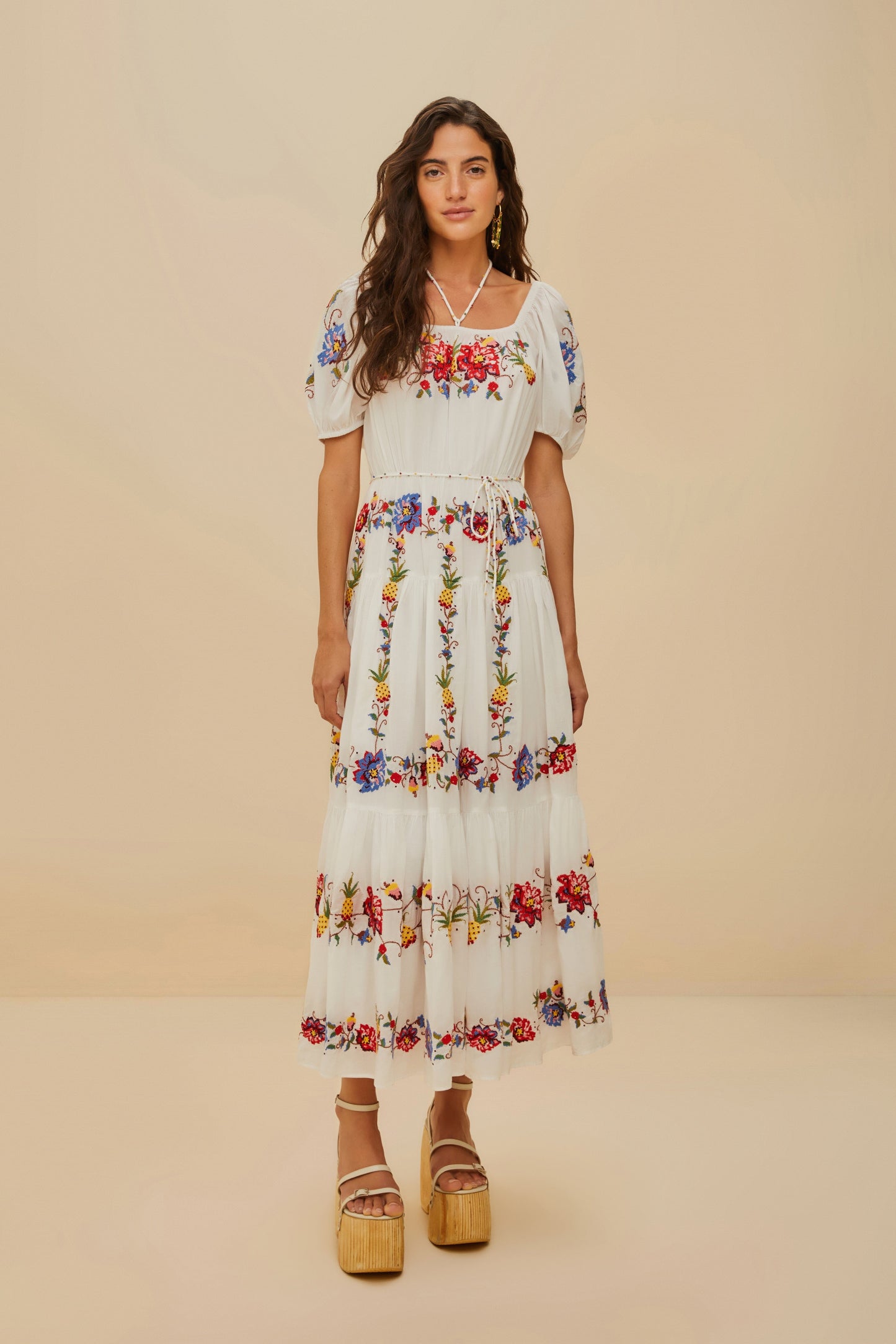 Embrace a touch of tropical charm with the off-white tropical porcelain embroidered maxi dress from FARM Rio. Its exquisite off-shoulder silhouette creates an effortlessly elegant look, while delicately embroidered tropical motifs evoke warmth and wanderlust. The flowing, maxi length enhances a graceful silhouette, and the soft, breathable fabric ensures comfort on sunlit days. This captivating piece is a celebration of vibrant artistry and sophisticated style, perfect for sun-kissed moments and moonlit evenings.