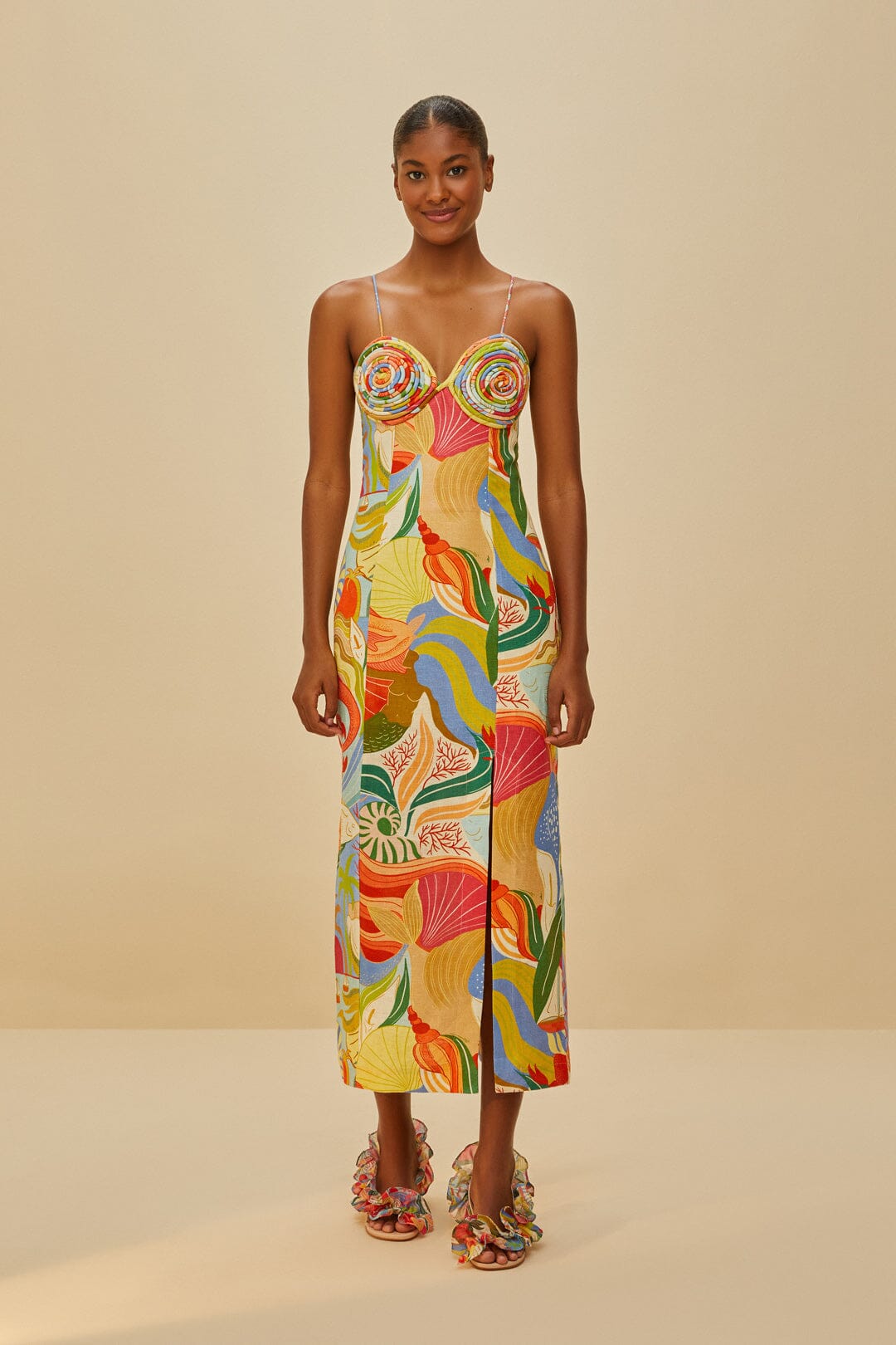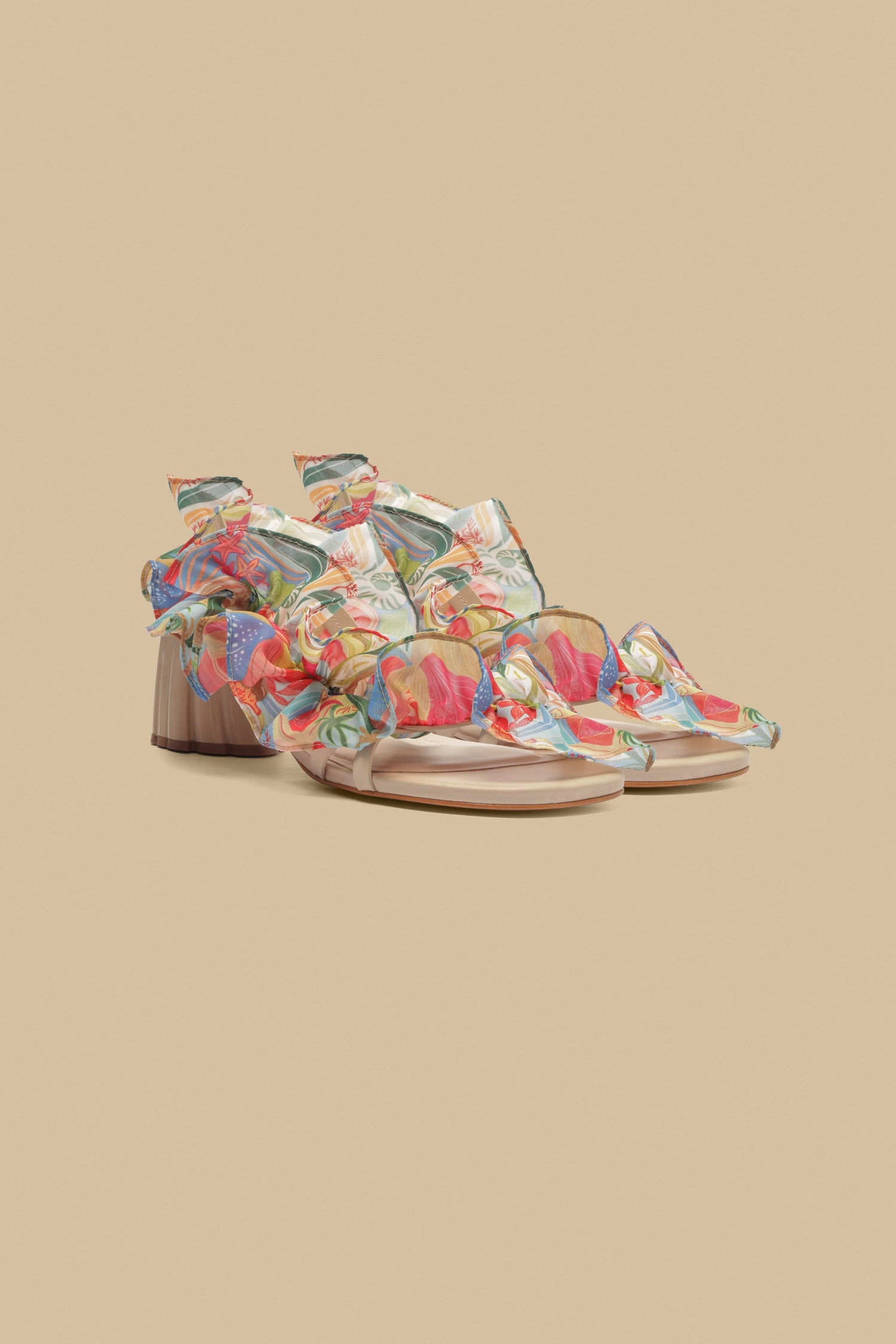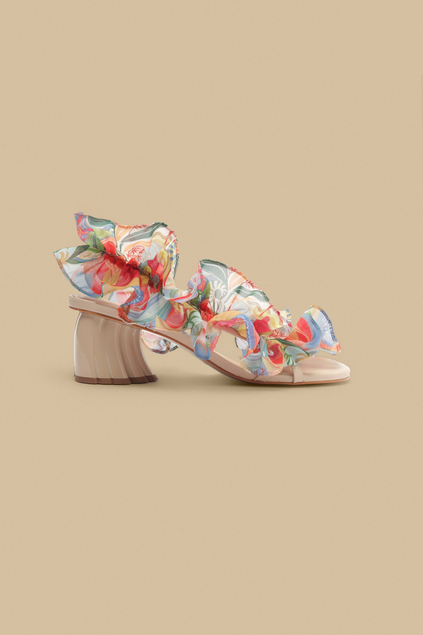 Step into a vibrant dreamscape with the multicolor ocean view monstera heeled sandal by FARM Rio. Crafted from responsible materials, these heels boast an enchanting array of swirling hues and delicate embroidery. The playful ruffles add a charming touch to the voluminous silhouette, making each step feel like a joyful dance. Perfect for infusing any ensemble with the lively, artistic spirit of a sun-soaked escape.