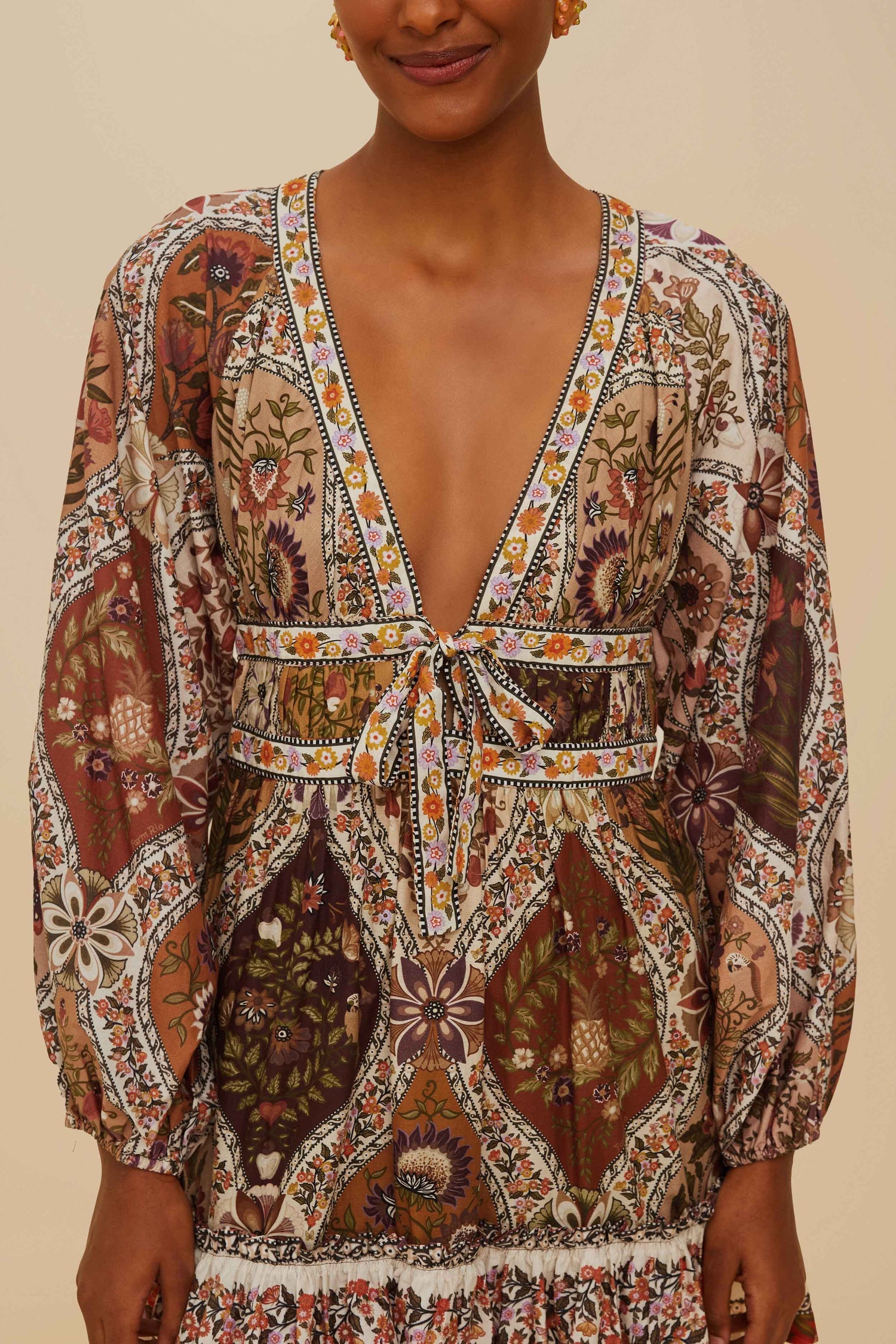 Step into a world of enchantment with the multicolor romantic nature mini dress from FARM Rio. This captivating piece showcases a vibrant array of colors and intricate floral patterns reminiscent of a blossoming garden. The playful mini silhouette, combined with a flattering V neckline, effortlessly captures a sense of warmth and whimsy. Delicate ruffles add movement and charm, making each wear feel like a celebration of nature's beauty.