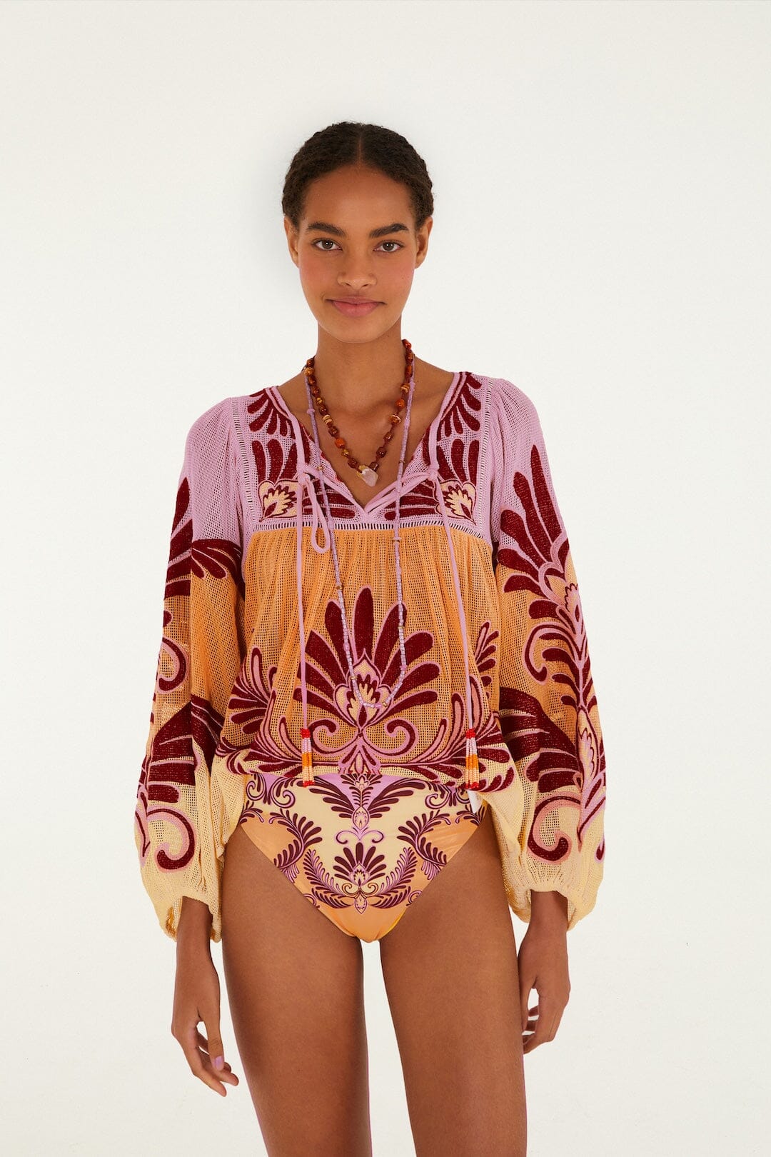 Embrace the sun with the Soft Yellow Arabesc Hot Pants Bikini Bottom from FARM Rio. Crafted in a vibrant, warm yellow, this playful piece features a flattering high-cut silhouette that elongates the legs while offering comfortable coverage. The delicate arabesc pattern adds a touch of whimsical charm, making every movement feel light and joyful. Perfect for those carefree beach days, it pairs effortlessly with your favorite tropical vibes.