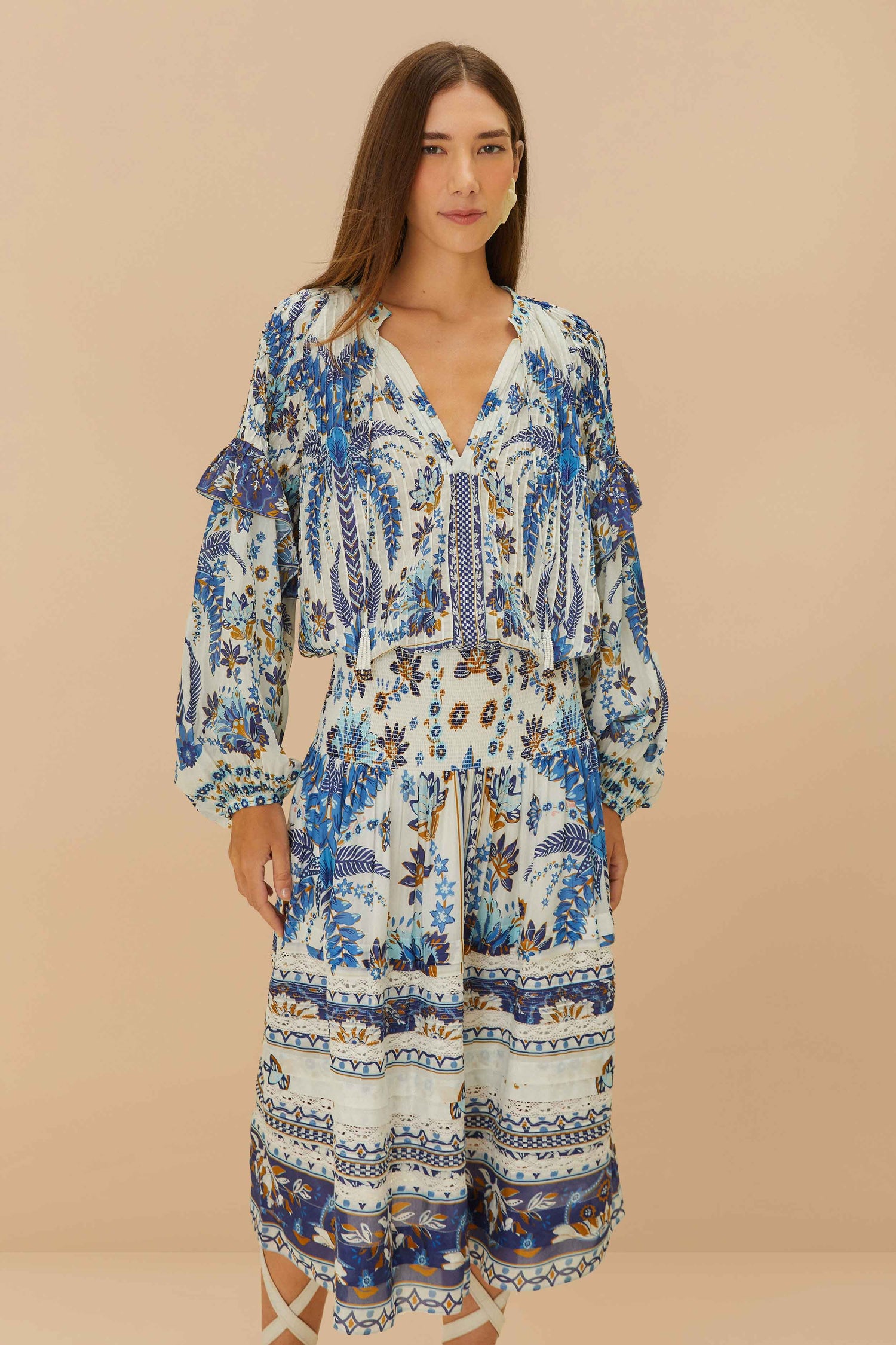 Embrace enchantment with the Off-White Ana Tapestry Organic Cotton Midi Skirt. Adorned with intricate floral and geometric patterns in serene blues and earthy tones, this skirt captures a harmonious blend of artistry and nature. Crafted from responsible materials, its flowing silhouette and gentle pleats create an effortless elegance. Elevate your wardrobe with a piece that resonates warmth and playful charm.