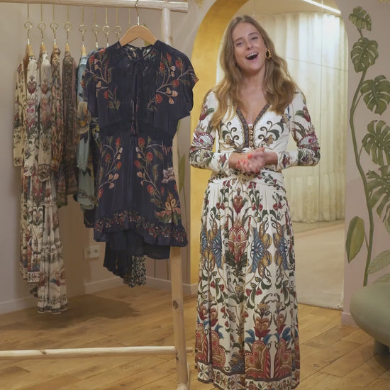 The Black Berry Garden Mini Dress captivates with its rich black fabric adorned by vibrant berry-inspired floral embroidery in red, green, and peach hues. The round neckline features delicate sheer lace panels, flowing into softly fluttering sleeves that enhance its airy silhouette. Playful ruffles trim the hemline, adding a touch of movement and charm to this feminine and effortlessly elegant dress, perfect for embracing warm, joyful moments.