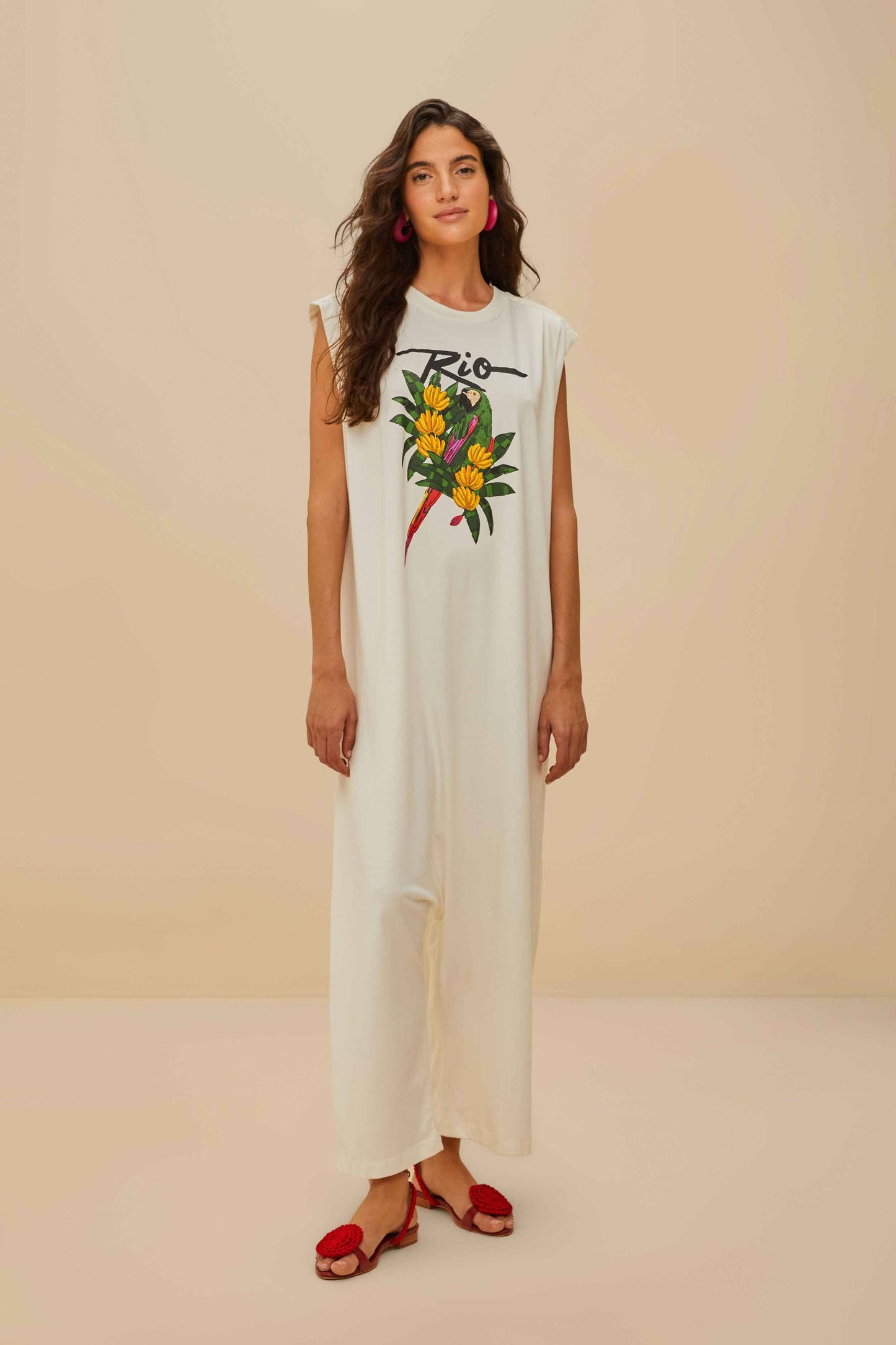 Embrace tropical charm with the Off-White Rio Macaw Organic Cotton Jumpsuit. This piece, crafted from responsible materials, marries a relaxed silhouette with a playful round neckline, offering effortless elegance. The lush macaw and florals print bursts with vibrant colors, celebrating Rio's lively spirit. Perfectly blending comfort and style, this jumpsuit invites you to explore the world with a playful touch and a hint of Brazilian magic.