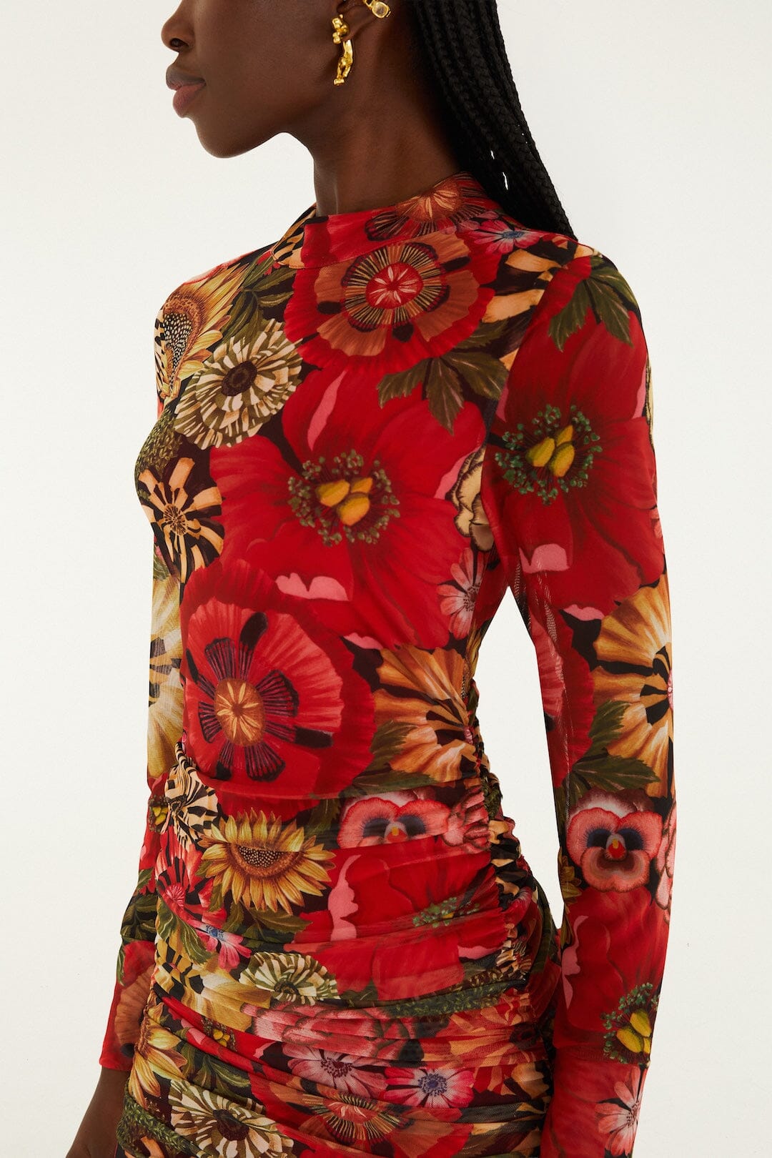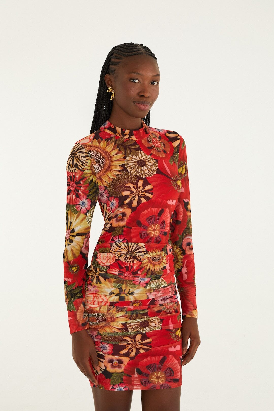 Embrace effortless charm with the Black Flowershop Tulle Mini Dress by FARM Rio. This playful silhouette features a high neckline and layers of delicate black tulle adorned with vibrant floral embroidery, creating a dreamy garden of color and texture. The airy fabric gently dances with every step, while subtle ruching adds a soft, flattering shape. Perfectly blending whimsy and elegance, this dress invites you to celebrate life’s joyful moments with vibrant ease.