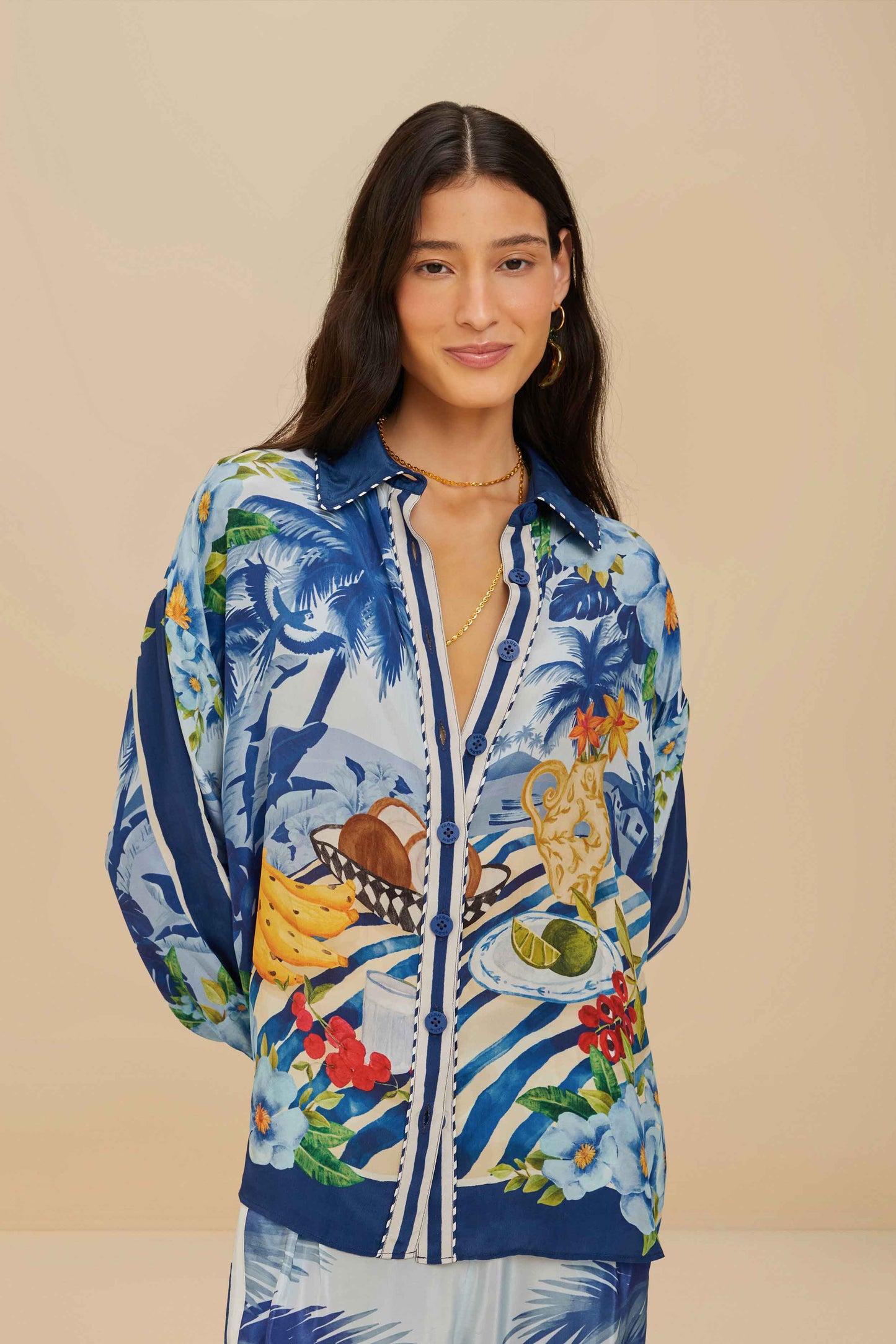 Step into a tropical daydream with the Blue Fresh Table Scarf Pajama Shirt by FARM Rio. This vibrant piece features a collar neckline and a breathtaking tapestry of lush blue tones adorned with playful fruit and floral motifs. The relaxed silhouette blends comfort with whimsy, making each wear feel like a mini-vacation. Let the artistic design and rich colors wrap you in a warm embrace, sparking joy with every glance.