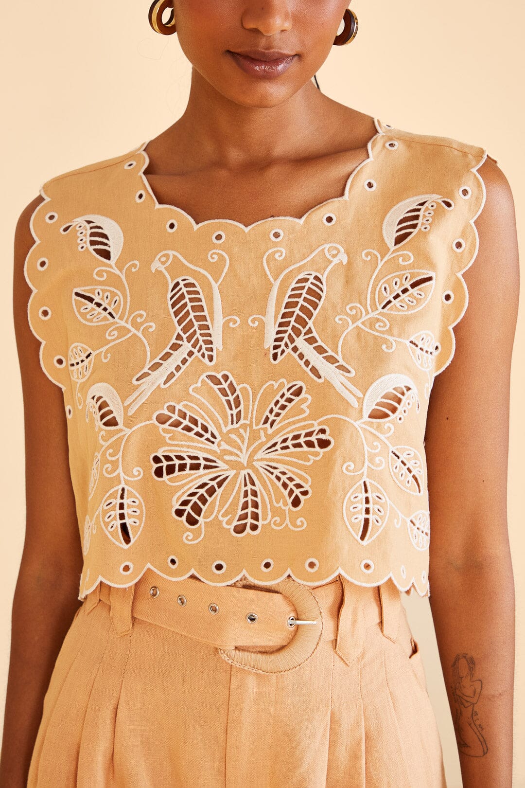 We’re just speechless looking at your new wardrobe staple: the Sand Richelieu Sleeveless Crop Top is what you were dreaming about to shine everywhere! You'll turn all moments into memorable occasions, from wedding situations to sunny plans at the park. It features an incredible richelieu work in its easy fit with an open back, and all your printed bottoms will be a WOW match to create a traffic-stopping look <3