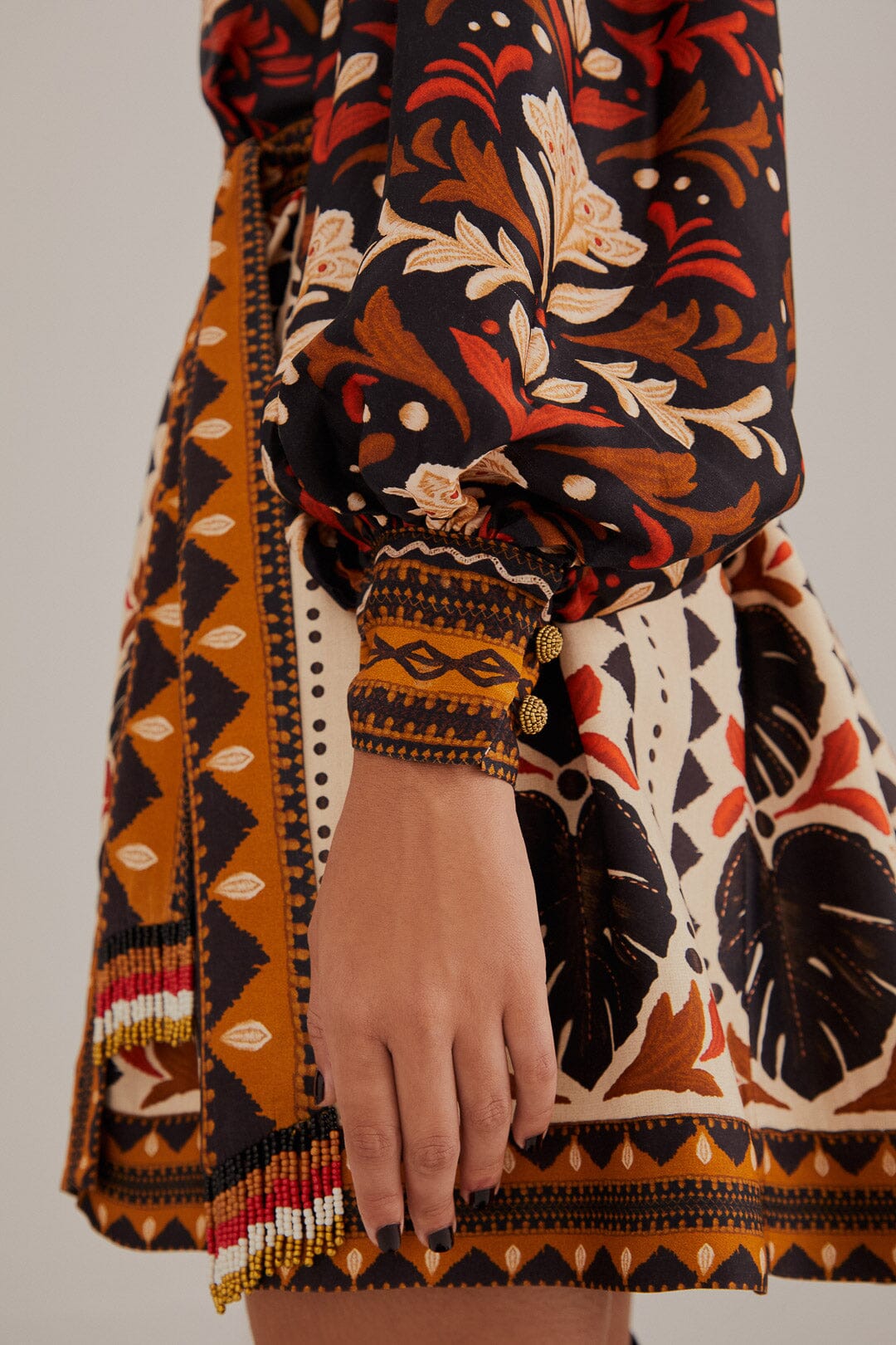 - Ties at waist with beaded tassels